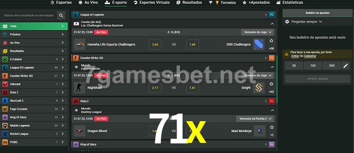 O 71x oferece uma grande seleção de opções de apostas em e-sports com probabilidades competitivas